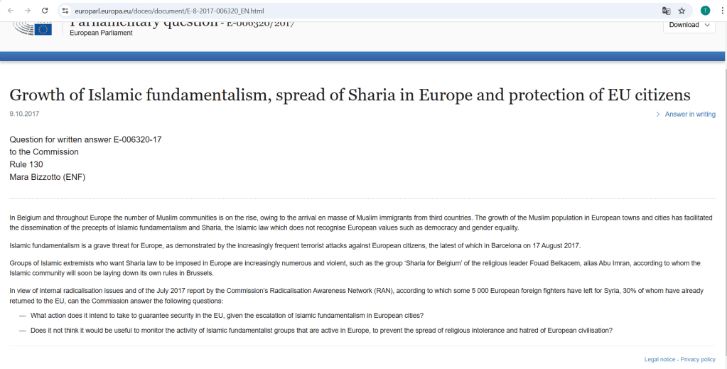 Growth of Islamic fundamentalism, spread of Sharia in Europe and protection of EU citizens